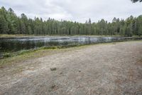 A gloomy day in Toronto, Canada, with a grey sky reflecting in the calm waters of the lake. Coastal landscape with trees and vegetation surrounding a park bench on the side of the road.