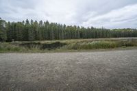 This image captures a gloomy day in Ontario, Canada. The grey sky reflects over a small lake, creating a serene and moody atmosphere. Surrounding the lake is a forest of trees and a small pond, adding to the natural beauty of the landscape. In the foreground, there is a dirt field, contrasting with the lush vegetation. This photo perfectly depicts the coastal region of Ontario, showcasing the harmony between land and water. Experience the tranquil and serene ambiance of this picturesque scene.