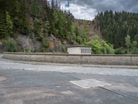A gloomy European landscape featuring a classic architecture dam in Germany. Grey skies loom above a rural road lined with forest trees. Concrete streets contrast with nature's profile.