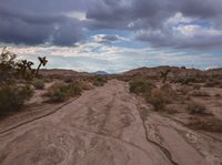 A rugged off-road track in California's desert. The gloomy grey sky adds to the desolate nature of the landscape. Mountains loom in the distance while a dry riverbed runs alongside the road surface.