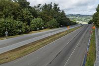 A gloomy landscape with an empty freeway stretching into the distance. The grey sky contrasts with the lush vegetation on the slopes. Armco barriers and guard rails line the road, surrounded by forests and green land lots.