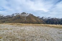 a bench in the middle of a gravel road overlooking mountains and snow covered peakss