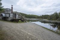 This captivating stock photo features an old train carriage sitting in front of a picturesque pond, surrounded by lush trees and vegetation on both sides. The image showcases a gloomy day in Ontario, Canada, with a grey sky and a reflection of the landscape on the water's surface. The wooden steps leading to the carriage add a rustic touch to the scene. The serene coastal atmosphere, combined with the fluvial landforms of streams and the rural setting, creates a captivating and peaceful ambiance. This stock photo is perfect for illustrating concepts related to nature, transportation, and Canadian landscapes.