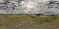 a fisheye lens view shows a golf course in the distance of the photo, as if taken from a moving vehicle