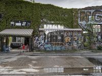 This stock photo features a graffiti-covered building in Berlin, Germany. The building is located in a residential area with green leaves and water in the foreground. The graffiti on the building's walls adds an artistic touch to the urban surroundings. The image captures the unique blend of classic architecture and street art in this European city. The grey sky adds a touch of gloom to the scene, creating a moody atmosphere. The photo showcases the vibrant art district and the urban design of Berlin, as well as the rugged charm of the Hinterhof courtyards. It is a perfect representation of the city's lively and creative atmosphere.