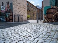 A gate with graffiti on it stands at the end of a cobblestone street in Berlin, Germany. The street is empty and there are no pedestrians in sight. The vibrant graffiti on the gate adds a splash of color to the urban design of the city. The clear sky and hard shadow create a contrast, highlighting the street's unique features. This photo captures the essence of city life in Berlin, offering a glimpse into the urban landscape and the vibrant culture it holds. The gate seems to be the entry to a restaurant or bar, making it a perfect spot to enjoy a meal or a drink while experiencing the dynamic atmosphere of Europe's thriving capital.