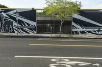 This black and white photo captures an urban street in Los Angeles, featuring a graffiti-covered wall and a bike lane alongside it. The street is lined with trees, and the surrounding area has a mix of residential buildings and public spaces. The artistic graffiti adds a touch of creativity to the urban landscape, making it a perfect embodiment of city life and artistic expression in Los Angeles.