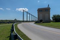 This is an image of a road in a suburban area of Canada. The road is lined with grass and trees, and there is a guard rail and curb along the side. In the distance, there is a bridge with two long towers. The sky is cloudy, creating a moody atmosphere. This photo represents the infrastructure and residential landscape of a suburban area in Canada. It could be a road leading to a museum or to a popular tourist destination like Niagara Falls.