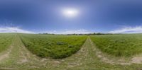a panoramic view of two paths running through a grass field and the sky is partially cloudy