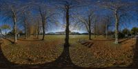 a panoramic photograph shows a few trees and grass in the foreground with a grassy area