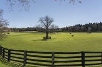 a grassy pasture with a few cows grazing on the field, and a tree near the fence