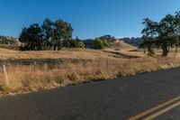 This is an image of a rural road running through a mountainous landscape. The asphalt road is surrounded by grass and vegetation, with trees lining the horizon. The clear sky above highlights the natural beauty of the highland terrain. The road surface is visible and there are tints and shades in the surrounding area. This photo represents a peaceful day in the countryside, showcasing the rural beauty and agricultural land lots.