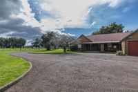 A gravel driveway leads to a garage situated next to a large, lush grassy field. The clear sky provides a picturesque backdrop to this rural landscape.