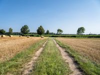 This image captures a rural landscape in Germany, with a straight dirt road traversing a lush green field. In the background, round bales of straw can be seen, symbolizing the harvest season. The clear sky above adds to the picturesque scene. This photo showcases the natural beauty of the European countryside and the agricultural traditions of Germany. It's a perfect representation of a sunny day and the harmony between nature and human activity.