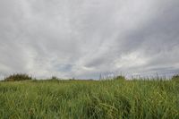 tall grass on a hillside under a cloudy sky with a lone tree in the foreground