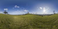 a wide - angle view of green grassy plains with trees on top of the hill