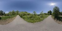An elevated view of a straight road in Ontario, Canada. Lush green grass and vegetation line the road, creating a picturesque landscape. The clear sky and sunlight add a touch of warmth to the scene.