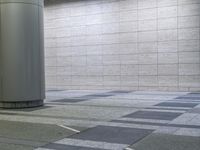 a modern restroom area with tiled floor, white columns and tiled walls and flooring