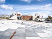 This image showcases the modern architecture of a building in Berlin, Germany. The building features brick stairs and a large checkered tile floor in an open space plaza. The grey tones of the building and the clear sky above create a contemporary urban design. Surrounding the building are trees and vegetation, adding a touch of nature to the city landscape. This photo captures the bustling city life and the architectural beauty of Berlin. It represents the modern and vibrant atmosphere of the city in Europe.