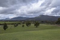A gloomy day in the highlands with grey skies and cumulus clouds hovering over lush green fields and trees. The view of the mountains from the hilltop near the park creates a serene and peaceful landscape.