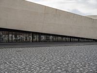 This is an image of a modern architecture building in Lisbon, Portugal. The grey and black-and-white facade creates a symmetrical composition. The empty road and sidewalk surface made of asphalt and cobblestone lead up to the building. The cloudy sky adds to the atmosphere of the scene. This photo represents contemporary architecture in Europe, specifically in Lisbon, Portugal.