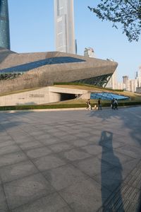 a stone building has a modern style architecture in it's centerpiece, as seen from the plaza