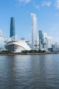 A modern coastal cityscape in Guangzhou, China. Futuristic architecture and a clear sky reflects on the water of the harbor. The city's skyline is a combination of modern and traditional buildings, creating a stunning coastal view.