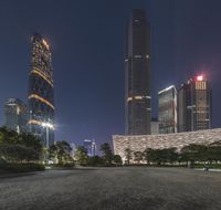 A stunning night view of Guangzhou, China's bustling business district. The modern architecture and skyscrapers create a futuristic cityscape. The neon lights illuminate the city, contrasting with the clear night sky.