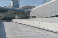 a man on a skateboard in an empty walkway near the cityscape of tall buildings