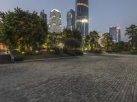This stunning image captures the beauty of Guangzhou, China at dawn. The city skyline, with its impressive skyscrapers and modern architecture, is illuminated by the first light of day. The clear sky and artificial lights create a mesmerizing cityscape. The cobble stone courtyard and open plaza add an element of urban design to the scene. In the foreground, a tree provides a touch of nature in this bustling metropolis. This photograph perfectly portrays the vibrant city life and business district of Guangzhou.
