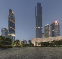 This is an image of China's financial district in Guangzhou at night. The city skyline is illuminated by street lamps, creating a dazzling display. The modern architecture and skyscrapers dominate the cityscape, showcasing China's rapid urban development. The clear sky above provides a beautiful backdrop for the high-rise buildings. In the foreground, cobblestone streets and open spaces give the city a unique charm. This photo captures the energy and vibrancy of city life in Guangzhou's business district.
