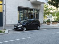 This is a photo of a modern residential building in Hamburg, Germany. The image captures the city at dawn, with a road made of asphalt stretching in front of the building. The architecture of the building reflects modern design trends in Europe. A compact car and a subcompact car can be seen parked in front of the residential area, representing the transport options available in the neighborhood. This photo showcases the vibrant city of Hamburg and the contemporary living experience in HafenCity.