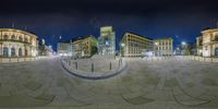 panorama of a square in the middle of a city at night with buildings surrounding it