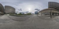 panorama of view into a building at the end of an empty street, with some buildings in the background