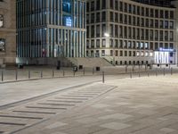 An empty plaza in Hamburg, Germany, surrounded by modern and classic architecture. The plaza features a mix of open spaces, tables, and stairs. Illuminated by artificial lights, it creates a vibrant and inviting atmosphere in the dark of the night.