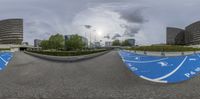 Aerial view of Hamburg's urban design. Modern architecture in the business district with straight roads and open spaces. Elevated parking garages and charging stations for electric vehicles. City life in Deutschland at high positions.