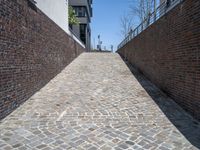 This is an image of a straight road in a residential area of Hamburg, Germany. The modern urban design is evident in the architecture of the buildings and the cobblestone road. The clear sky above contrasts with the brick walls and the flooring. This photo captures the essence of city life in Hamburg, showcasing the urban landscape and the modern residential area. The alley-way provides access to the city, with a driveway entry leading to the road. This image represents the combination of modern architecture and traditional elements in Hamburg, Deutschland.