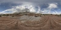 a landscape photo with a very cloudy sky behind it that has many curves of dirt on the ground