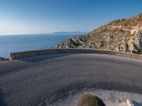 This is an image of a road going up a mountain near the ocean in Mallorca, Spain. The clear sky and elevated landscape provide a breathtaking view of the coastal coastline. The road features an Armco barrier and a guard rail for safety. In addition, there is a ramp for bikes to make it easier to cross the roadway. The image represents the high and nature-focused infrastructure of Mallorca, a popular destination in the Balearic Islands of Europe.