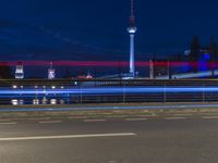 A nighttime cityscape of Berlin, Germany. The high-rise buildings and skyscrapers with illuminated windows create a stunning view. The streets are bustling with motion blur from passing vehicles. Towering street lights cast a beautiful glow on the asphalt roads.