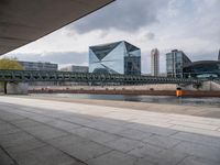 This is an image of a modern architecture skyscraper in Berlin, Germany. The cityscape showcases the urban design and high-rise buildings that dominate the metropolitan area. The clear sky above contrasts with the concrete facades and asphalt roads below. In the foreground, a bridge spans across the water, adding to the city's architectural appeal. This photo represents the vibrant city life of Berlin, where modern architecture and urban design thrive.