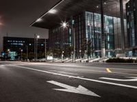 A modern cityscape in Long Beach, California. Bright streetlights illuminate the empty streets at night. Glass office buildings reflect the artificial light. The grey sky adds to the overall gloomy ambiance.