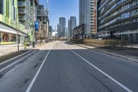 A stunning view of Toronto's modern architecture and skyscrapers. The straight road leads towards the city center, surrounded by well-maintained public spaces and lush vegetation. The clear sky provides a perfect background for this vibrant cityscape.