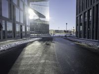 This is an image of a modern cityscape with high-rise buildings and condominiums. The architecture is characterized by sleek lines and windows that reflect the sunlight. The roads and thoroughfares are made of black asphalt, creating a contrast against the white flooring of the buildings. The urban design of the neighborhood showcases a well-planned infrastructure. This photo represents a bustling city with a focus on modern buildings and infrastructure.
