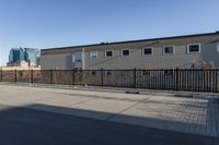 A modern high-rise office building in the bustling business district of Toronto, Canada. The sleek metal and composite material facade stands against a clear sky backdrop. The urban design includes a parking lot and loading dock.