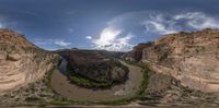 a panoramic photo of a wide river that runs between two rocky cliffs on top of a slope