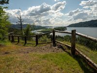 An idyllic landscape of rolling highlands, lush green grass, and a serene lake. The sky is dotted with fluffy clouds and trees provide a natural border. A split rail fence separates the land lot, creating a perfect recreational park.