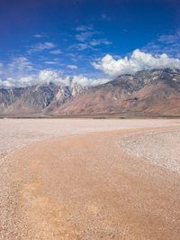This is an image of a rugged desert landscape with sandy plains and towering mountains in the background. The sky is clear and cloudless, adding to the vastness of the scene. The road surface is made of asphalt, contrasting with the highland terrain. This off-road track leads to a remote destination, surrounded by nature. The absence of people in this photo highlights the serenity and untouched beauty of the desert. It is a perfect representation of a day of adventure and exploration in the rugged wilderness.