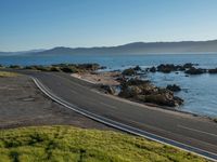 A scenic coastal road with asphalt surface winds through highlands and hills, offering breathtaking views of the ocean. The clear azure sky and sunlight create a picturesque landscape for recreational activities and nature exploration.