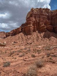 A clear sky frames the breathtaking landscape of Capitol Reef in Utah, USA. The open space is dotted with dirt and gravel surfaces, creating a natural and rugged beauty. Explore Highway 12 for an unforgettable day in nature.